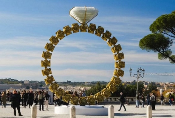Ez az óriási „pasziánsz gyűrű” 110 arany autófelniből készült, tetején pedig egy 1450 kristálypohárból álló fordított piramis található, amelyek úgy verik vissza a fényt, mint egy lebegő gyémánt. A mű az átalakulásról, a státuszszimbólumokról és az identitásról szól, ötvözve a mesterségbeli tudást, a látványosságot és az iróniát, mindezt Róma egyik legikonikusabb nézőpontja keretezi.