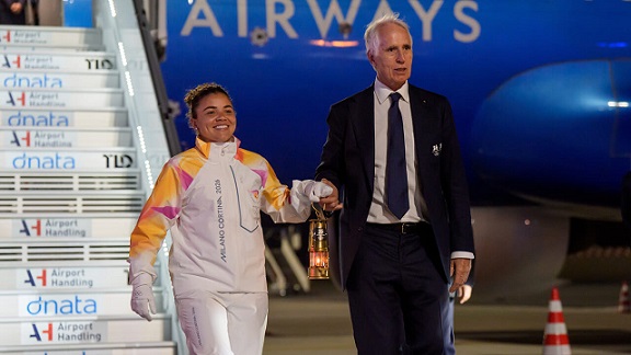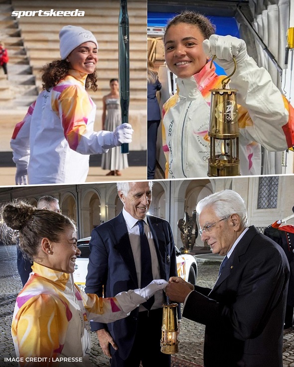 Az ötkarikás jelképet korábban lobbantották fel a játékok bölcsőjében, a görögországi Olümpiában, majd egyhetes görögországi útja után csütörtökön 11 órakor adták át a teljesen márványból épült athéni Panathinaiko Stadionban az olasz szervezőknek. A lángot aztán egy kis lámpásban szállították át Athénból Rómába, a Fiumicinói repülőtérre, a repülőgépről pedig az olimpiai bajnok teniszező, Jasmine Paolini és a játékok szervezőbizottságának elnöke, Giovanni Malago vitte le.