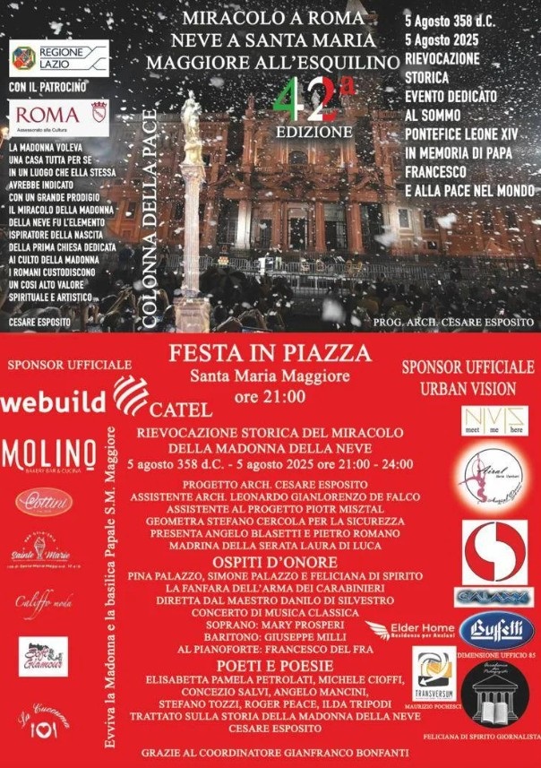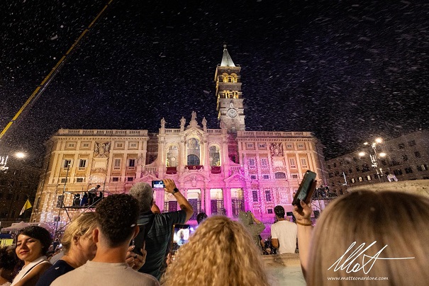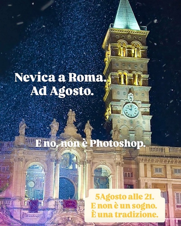 A Madonna della Neve/Havas Boldogasszony csodájára a Cesare Esposito építész által 1983-ban létrehozott esemény pedig immáron 42. alkalommal tért vissza a Santa Maria Maggiore bazilika előtti térre este 21 h-tól. Rómát fehér varázslat borította be a csillagok alatt, még balerina is repült a hópelyhek között.