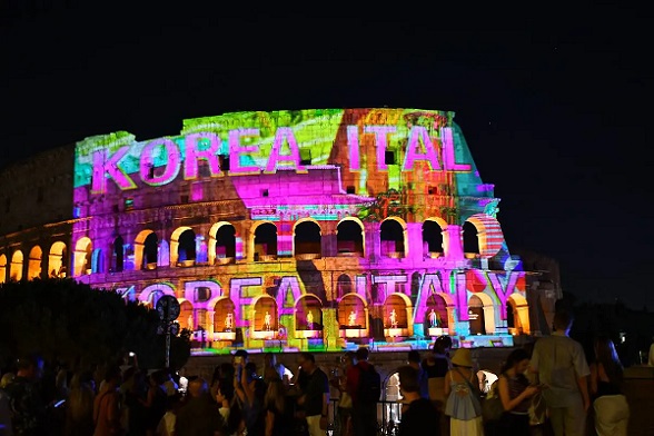 A Colosseum homlokzatára június 26-án este 21 h-kor egy rendkívül látványos fény- és digitális olasz- koreai művészeti bemutató került. Így ünnepelte meg Róma Olaszország és Korea közötti diplomáciai kapcsolatok 140. évfordulóját.