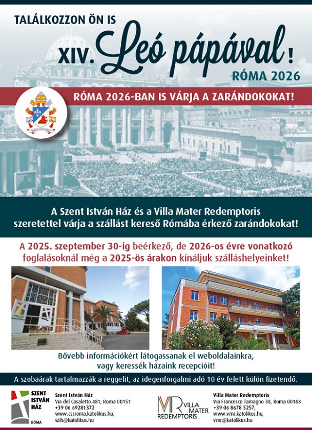 A Magyar Katolikus Püspöki Konferencia fenntartásában Rómában működő Szent István Ház és a Villa Mater Redemptoris felújított szálláshelyei megszépült környezetben várják a zarándokokat, magyar és külföldi vendégeiket. A 2026-os évre vonatkozó, de 2025. szeptember 30-ig beérkező foglalások esetén még a 2025-ös árakon kínálják szálláshelyeiket.