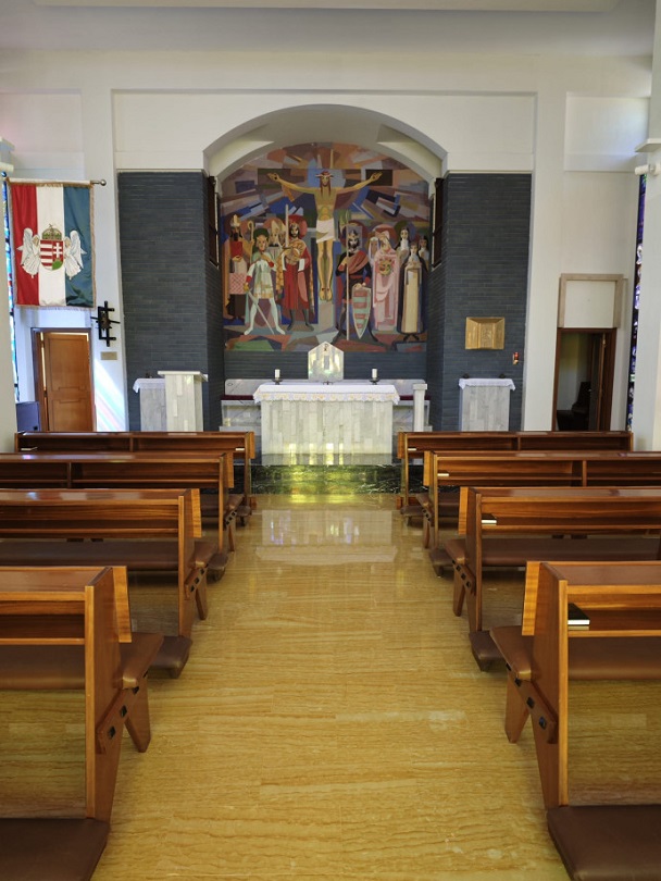 A kápolna szentélyét a ház egykori híres lakója, Prokop Péter kalocsai születésű és emigrációban élt pap, festő és író készítette, aki Rómában fejezte be képzőművészeti tanulmányait az 1950-es években, majd haláláig itt tevékenykedett. Az ő alkotásai díszítik a ház közösségi tereinek és szobáinak falait, és a kápolna szentélyét is, ahol secco technikával a magyar szenteket festette meg. Az ólomkeretes üvegablakok, illetve a kápolna bejárata fölötti betonba foglalt, Szent Istvánt ábrázoló üvegablak a napfelkeltétől egészen napnyugtáig csodálatos színjátékkal töltik meg a kápolna egyszerű vonalvezetésű, modern terét.