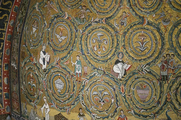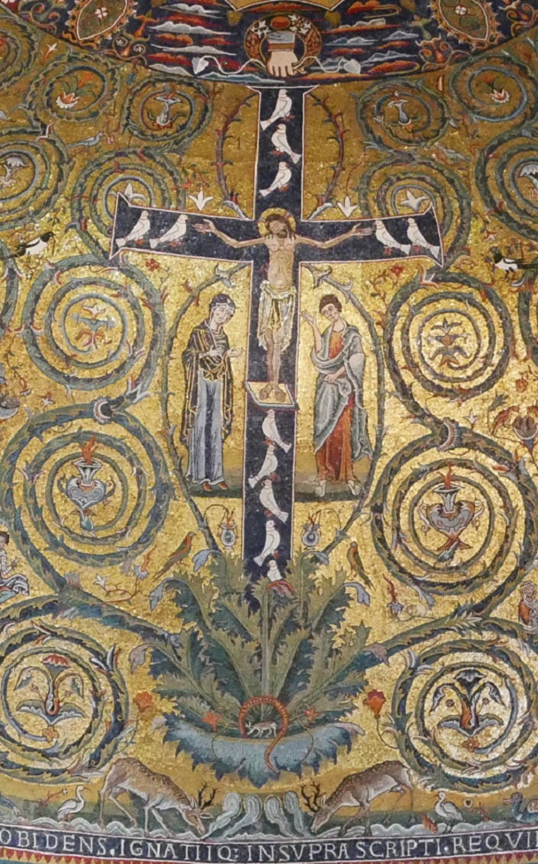 Az első felirat magát a mozaikot magyarázza. A körbe-körbe indázó szőlő az élő Egyház szimbóluma, melynek gyökerei a Paradicsomkertből indulnak, gyümölcse pedig Krisztus keresztje. Középen a szarvasok és a madarak – kócsag, páva, vadkacsa –, illetve a négy irányba feltörő víz az Édenkertre utal: „Az Úr Isten a földből mindenféle fát növesztett, amely tekintetre szép és táplálkozásra alkalmas; valamint az élet fáját is a kert közepén, meg a jó és a rossz tudásának fáját. Folyóvíz jött ki Édenből, hogy öntözze a kertet, utána pedig négy ágra szakadt.” (Ter 2,9-10) Az alsó sarkokban a paraszti életből vett jeleneteket láthatunk.