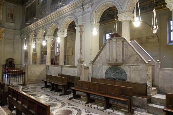 A 6. századi schola cantorum, azaz a kórusfülke és a szentélyernyő eredetileg az alatta lévő régi templomhoz tartozott. Az építmény végeire márványlapokat helyeztek, ezek között találunk olyanokat is, melyeken a munkát megrendelő II. János pápa (533-535) monogramja látható. A régi templomban a főoltárral szemben magasított szószékpár állt. Az újjáépítéskor az egyiket ambóvá alakították át, mellé pedig egy gyönyörű, spirálisan csavart, kozmata díszítésű húsvéti gyertyatartót helyeztek.