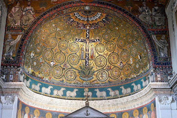 A diadalív bizánci stílusú mozaikjai – melyeknek felső részét az utólag beépített mennyezet furcsa módon eltakarja – a 12. századból származnak. A kompozíció csúcsán Krisztus, a Pantokrátor alakja látható, akit a négy evangélista szimbóluma szegélyez. A párkányokon szenteket látunk: balra Szent Lőrinc, aki Szent Páltól kap utasítást, jobb oldalon pedig Szent Péter és Szent Kelemen áll. Ez utóbbi egy horgonyt, a jelképét tartja a kezében. A négy alak alatt Izajás és Jeremiás prófétát fedezhetjük fel. Előbbi tekercsének felirata: „Láttam az Urat a trónon ülni”, míg utóbbié: „Ez a mi Istenünk, nincs hozzá fogható”. A kompozíció alján két város látható: balra Betlehem Gábriel arkangyallal, míg jobbra Jeruzsálem Szent Péter kakasával. A diadalív formáját követő feliraton ezt olvashatjuk: „Dicsőség a magasságban Istennek, aki a trónon ül, és a földön békesség a jóakaratú embereknek.”