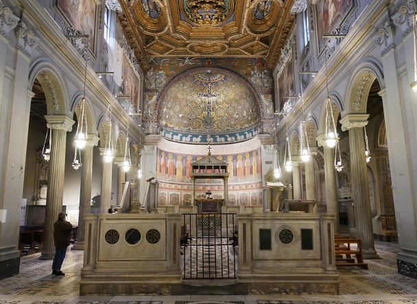 Belépve a bazilikába, igazi meglepetés érhet bennünket. A templom csodaszép padlója ősi, sokszínű, geometrikus formákra vágott kőből, főként márványból áll, melyekből változatos alakzatokat hoztak létre. Ez a stílus több római templomban is megtalálható, és a 12. századi híres kézműves család után kozmatikus (kozmata) néven ismert. A mester – valószínűleg Magister Paulus – nagyon sokféle követ használt fel művéhez: akad köztük tunéziai, sziénai, de spártai is. A rózsaszínű darabokat a görög Khiosz szigetéről hozhatták ide, míg a sötétvörös kő Egyiptomból való. A padlózat közepén Vincenzo Lauro bíboros (1523-1592) emléktábláját láthatjuk.