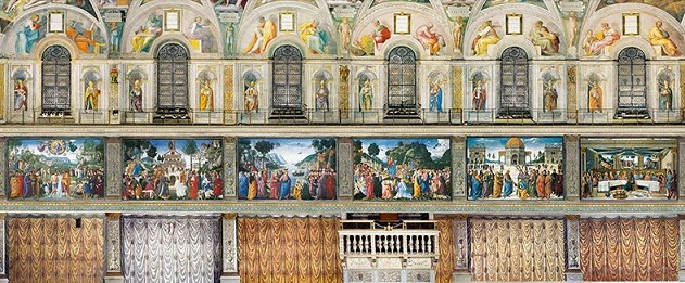 A kápolna falain Mózes és Jézus életének egymással szembenéző jeleneteit tematikailag rendezték. Így a kápolnába lépve a főoltár fölött a kezdetet Perugino mester ecsetje nyomán egymás mellett a Mózes születése-megtalálása és a Jézus születése freskót lehetett látni. Ők Ábrahám igazi ivadékai, nem pedig a Hágártól származó Izmael, akitől az iszlám hit eredeztette önmagát. Az egyes témák sorrendben. Az elsőt hangsúlyosan kiemelem, mert alig tudunk róla. A Sixtus-kápolna titulusa az Assumptio, Szűz Mária mennybevétele. Ezt festette meg Perugino a főoltár ablakai fölé, mint oltárképet, az ablakok alatt pedig Mózes születését-megtalálását, valamint Jézus születését.