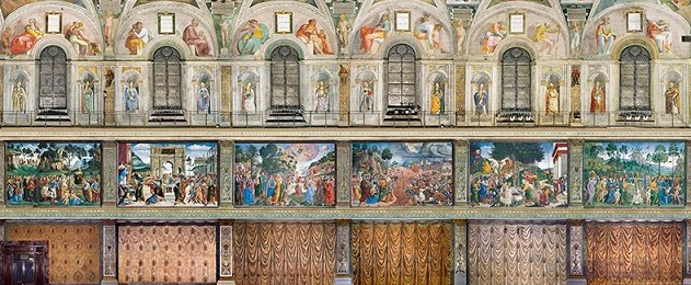Sixtus pápa nagyon sürgette a munkát, a festők lázasan dolgoztak és közel két év alatt be is fejezték a munkát. Minthogy három sávban festettek, az említett középső sáv lényegi jelenetei mellett a felső sávban az ablakok és a falpillérek közt megfestették a pápák egész alakos sorozatát, alul pedig ál fali-kárpitot pingáltak. A freskók alatti mezőt a kor szokásának megfelelően függöny-mintára festették, és az imitáció nem is volt hamis, mert a későbbiekben éppen Raffaello készített hatalmas kartonokat újszövetségi jelenetekkel, amiket Flandriában mesteri módon gobelin formájában megszőtték és ünnepi alkalmakkor fel is helyezték a falakra. Minthogy Firenze gyapjúkereskedő város volt és polgárai értékes és színes bársonyruhában jártak, vállukon földig érő súlyos köntösökkel, az ő jelenlétük a bibliai jeleneteket az akkori jelen korba hozta, mely azt üzente, hogy ők mindnyájan abban, az Istentől akart rendben élnek, melynek spirituális vezetője a római pápa.