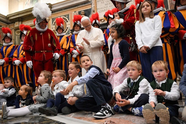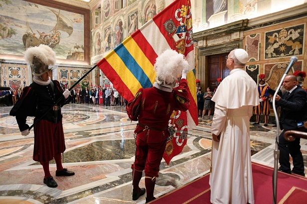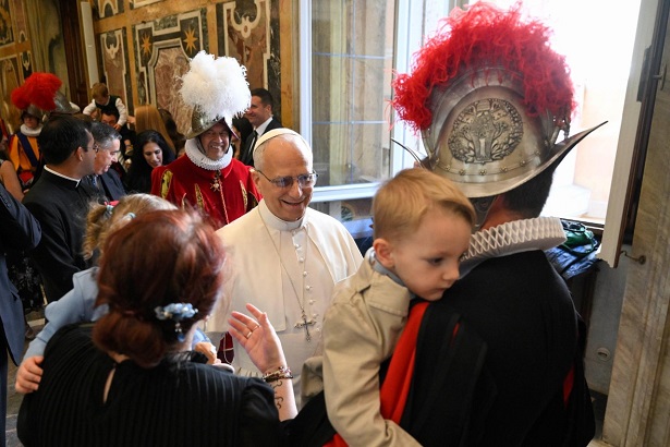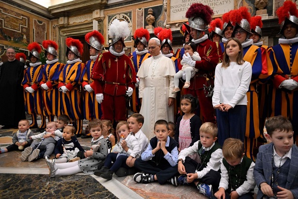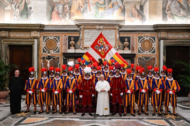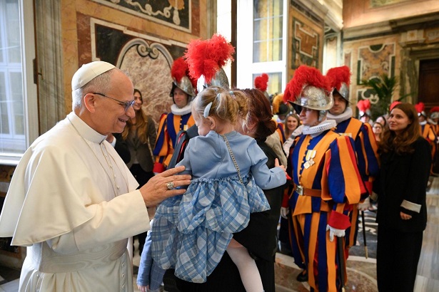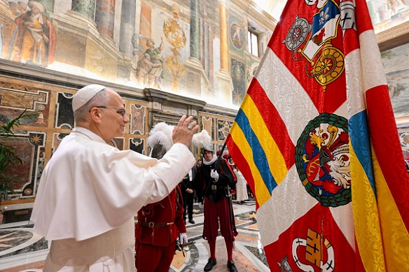 Ezután Leó pápa fogadta délben az Apostoli Palota Kelemen-termében a Pápai Svájci Gárda testületének 135 tagját, akik közül 27 újonc tesz esküt Szent Ferenc Tranzituszának előestéjén, azaz október 4-én szombaton 17 órakor az Apostoli Palota San Damaso udvarán.