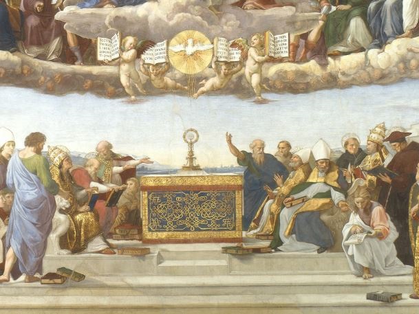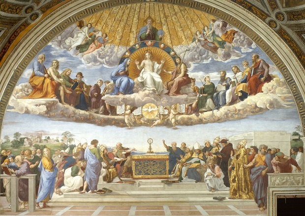 Raffaello két, talán legzseniálisabb freskója a vatikáni palotában, az egymással szemben megfestett „Athéni iskola” és az „Oltáriszentség disputája”. A fontos üzenetet hordozó perspektíva révén a két nagyszabású falkép titkos párbeszédet folytat egymással.