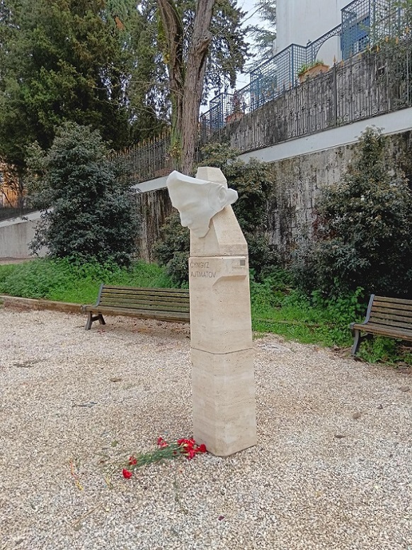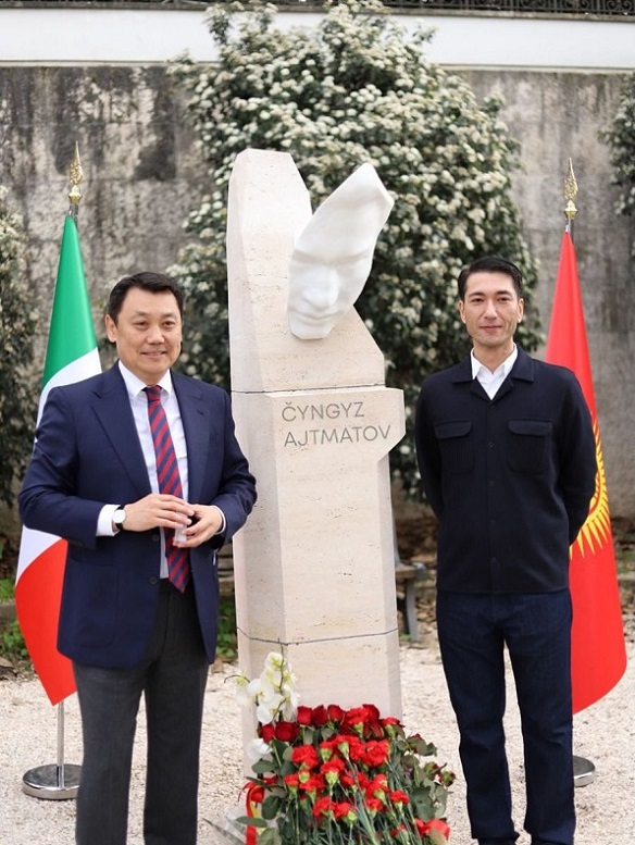A római Villa Grazioli parkban, a Kirgizisztáni Köztársaság nagykövete, Taalai Bazarbaev jelenlétében kerül sor Alekszej Moroszov kirgiz művész által Čyngyz Ajtmatov emlékművének felavatására.