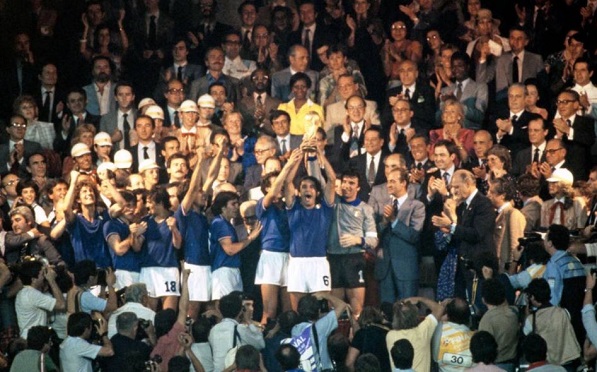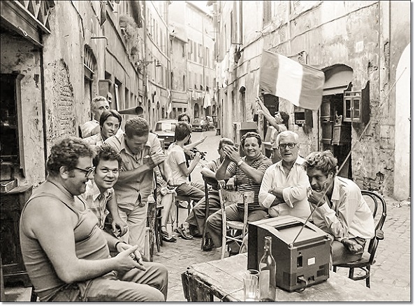 1982. július 11-én, vasárnap történt, hogy Olaszország 3-1-re legyőzte Németországot, és világbajnok lett... Róma emlékezetes ünneplési kakofóniában tört ki. Az itt látható kép a Parione negyedben található Via dei Cappellari utcát ábrázolja, akárcsak sok más utcát, például a Trastevere, a Monti és a Testaccio negyedeket, ahol az emberek kimentek az utcára együtt tévét nézni.