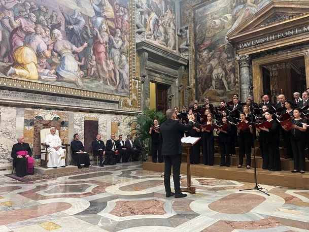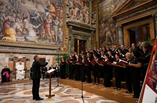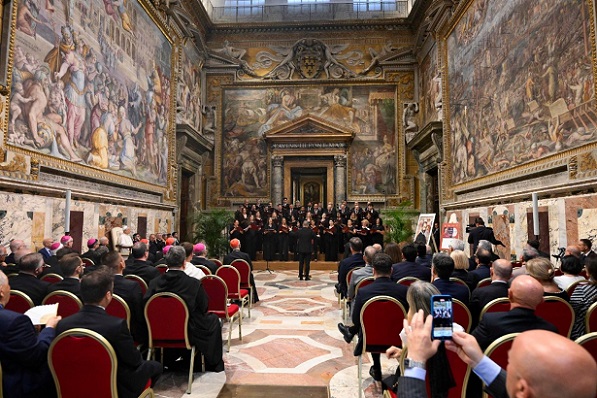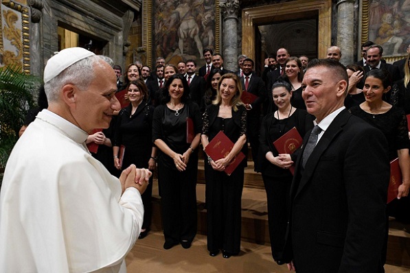 Ezért Leó pápa köszönetet mondott mindazoknak, akik lehetővé tették ezt a találkozót: a Bartolucci Alapítványnak, a felszólalóknak, a kórusnak és mindenkinek, a Szentatya imáiban megemlékezik róluk. Szent Ágoston a húsvéti Alleluja énekléséről szólva tanította: „Énekeljük hát most, testvéreim! Ahogy az útonjárók szoktak énekelni, énekeljetek, de haladjatok! Haladjatok előre, haladjatok előre a jóságban. Énekeljetek és járjatok! Ne térjetek le az útról, ne forduljatok vissza, ne álljatok meg!” (Sermo 256,3). Tegyük magunkévá az ő felhívását, különösen a jubileum szentév idején – kérte Leó pápa, majd apostoli áldását adta a jelenlévőkre.