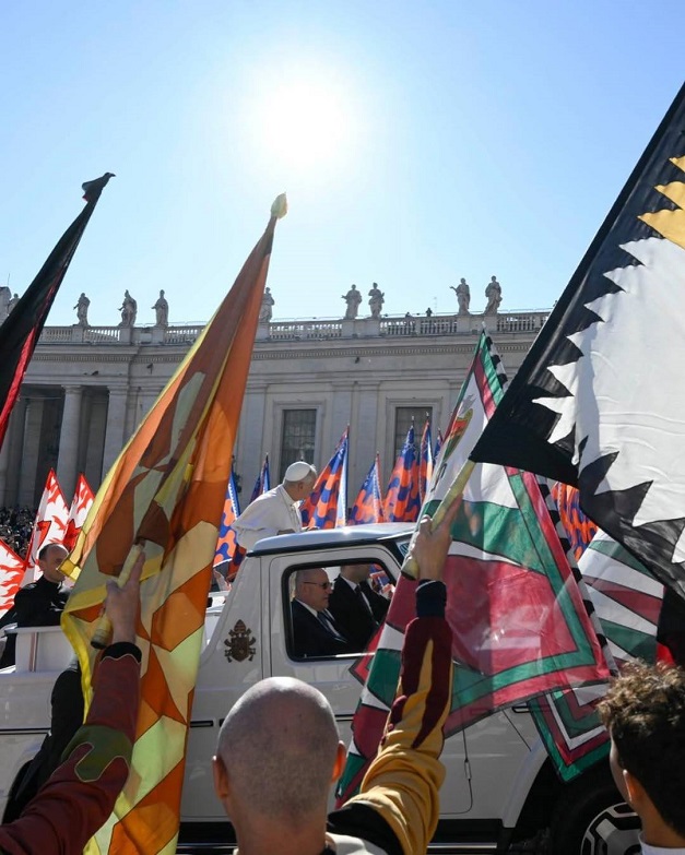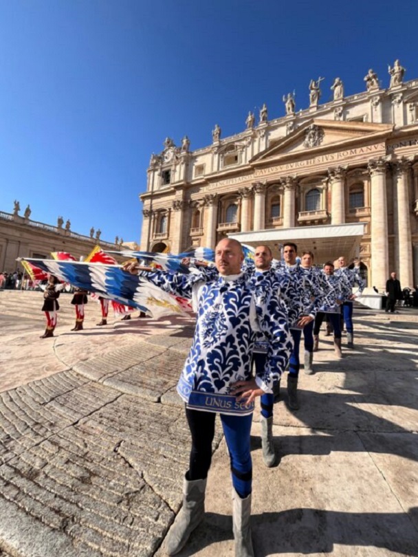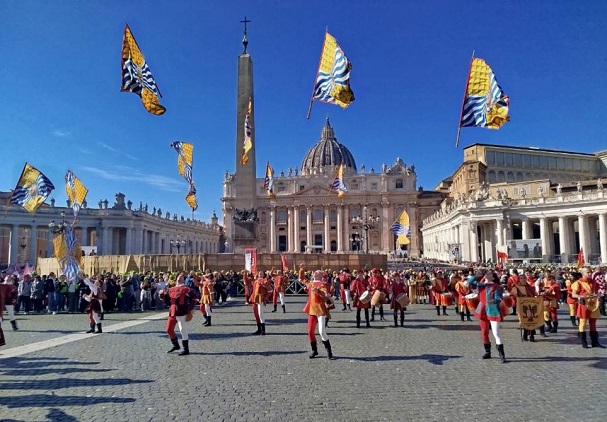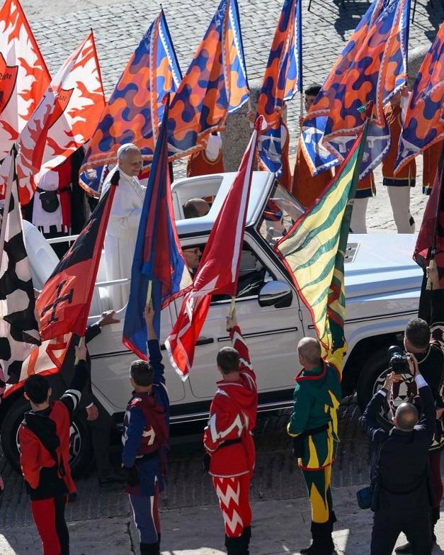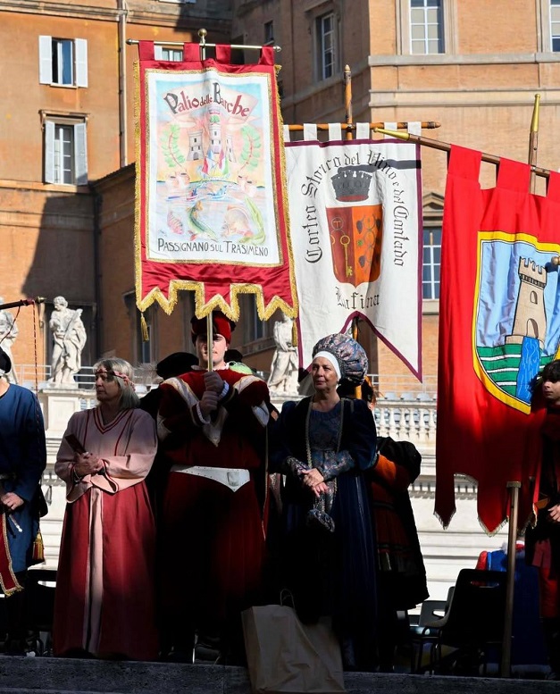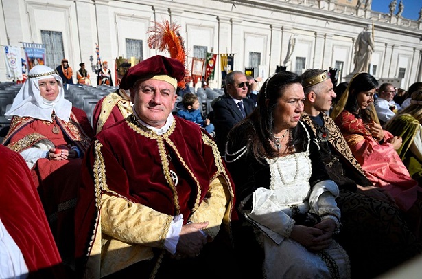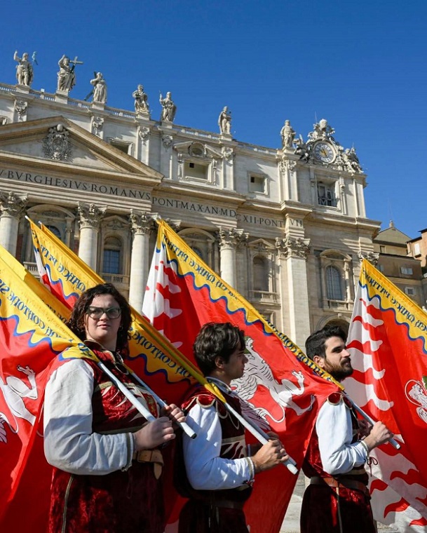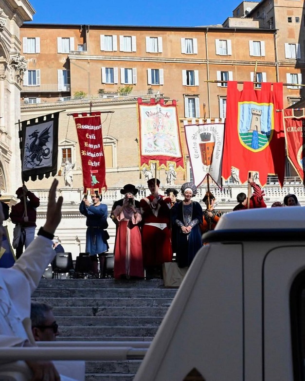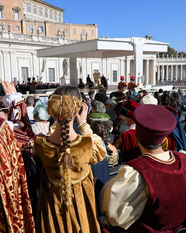 Dobok és trombiták jelezték a lovagok és hölgyek érkezését a Szent Péter térre az olasz történelmi rekonstrukciók jubileumára. Roberta Benini hangsúlyozta: „Ahogy XIV. Leó üdvözlésében említette, a hagyományok felélesztésével kapcsolatot teremtünk egy olyan ország történelme és hite között, ahol a keresztény értékek a kultúra és a művészet alapját képezik. Ez inspirációt ad a békés jövő építéséhez.”