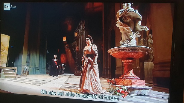 A nézőtéren és a televíziókon, interneten jelen levő közönség a Tosca eredeti változatát láthatta Adolf Hohenstein jelmezeivel és díszleteivel.