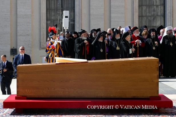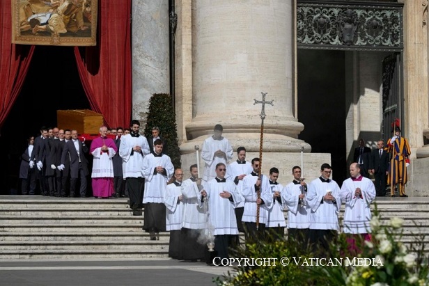 Az Ordo Exsequiarum Romani Pontificis, a pápák temetéséről szóló liturgikus könyv előírásai szerint zajlott a szertartás. A bazilika főhajójában 10 órakor elindult a koncelebráns bíborosok, köztük a keleti egyházak pátriárkáinak menete. A papság piros miseruhát viselt, ősi hagyomány szerint, ahogy a pápát is – a vértanúságra utalva – piros miseruhában temetik el.