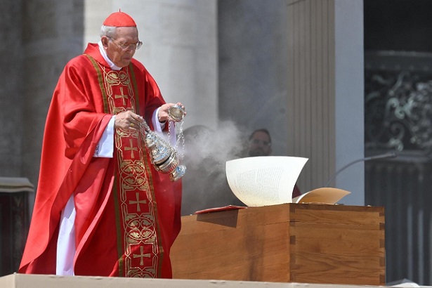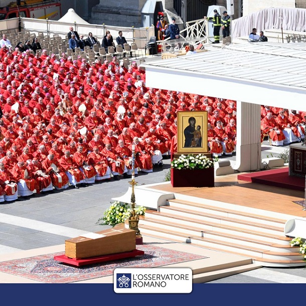 Április 26-án, szombaton 10 órától a Szent Péter-bazilika előtti téren celebrálták a szentmisét Ferenc pápa lelki üdvéért, mintegy 250 ezer ember részvételével. A szertartást Giovanni Battista Re bíboros, a bíborosi kollégium dékánja vezette; 980-an koncelebráltak, bíborosok, püspökök, papok. Ezt követően a koporsót a Santa Maria Maggiore-bazilikába, Ferenc pápa végső nyughelyére vitték.