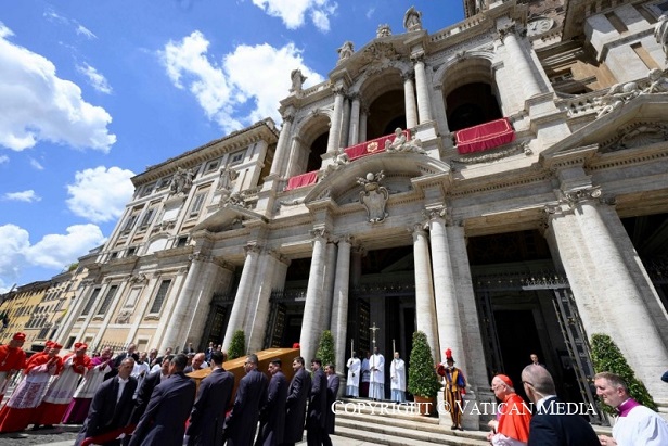 A pápát kísérő bíborosok és a Svájci Gárda tagjai, majd a koporsó is megérkezett a bazilikához, amelynek lépcsőin a Szentatyát a szegények várták, akik oly fontosak voltak neki péteri szolgálata során, akik felé mindig kiemelt szeretettel és figyelemmel fordult. A rászorulók – hajléktalanok, fogvatartottak, menekültek – képviselői, összesen negyvenen egy-egy szál fehér rózsával vettek búcsút a Szentatyától. Ott voltak a pápa családtagjai, a lépcsősoron jobb kéz felől pedig a templomban szolgáló papság, a Santa Maria Maggiore-bazilika káptalanjának kanonokjai és domonkos szerzetesek, akik gyóntatószolgálatot látnak el a templomban.