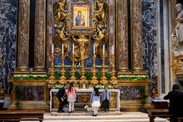 Ferenc pápa péntek este már lezárt, egyszerű, belülről cinlemezzel borított fakoporsóját az ünnepélyes menet kíséretében vitték ki a bazilikából az előtérben felállított szabadtéri oltárhoz, amelyben ott volt a néhai pápának oly kedves Salus Populi Romani-ikon.