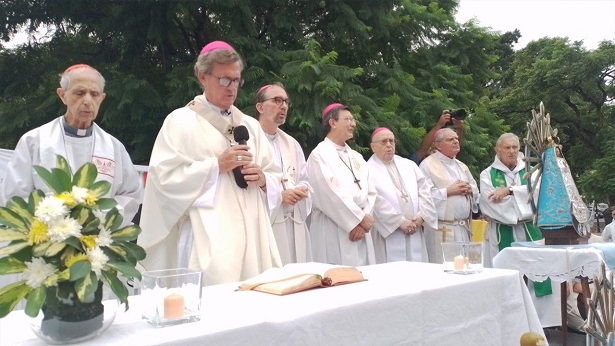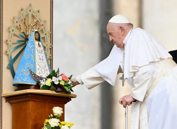 "Ma hazámban, Argentínában ünneplik a Lujáni Szűzanya ünnepét, akinek a képe itt is jelen van" – mondta, tapsot váltva ki a tömegből. "Imádkozzunk Argentínáért, hogy az Úr segítse útján. Jézus áldjon meg téged, és a Szent Szűz vigyázzon rád" – könyörgött. A 87 éves Ferenc pápa megállt imádkozni a Lujáni Szűzanya szobra előtt, amely jelen volt a szertartáson, s amelyen hívek ezrei vettek részt.
