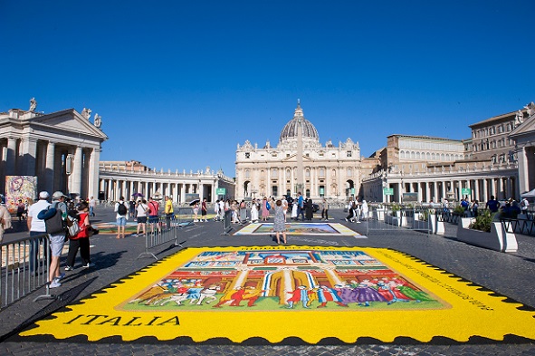 Sok szép virágszőnyeg készült június végén Rómában Péter Pál ünnepén, ezek közül most kiemelek egyet, mert nemcsak szép, de az idei 2025-ös szentév történelmi kezdetét mutatja be, a legelsőt, amelyet VIII. Bonifác pápa hirdetett ki 1300-ban.