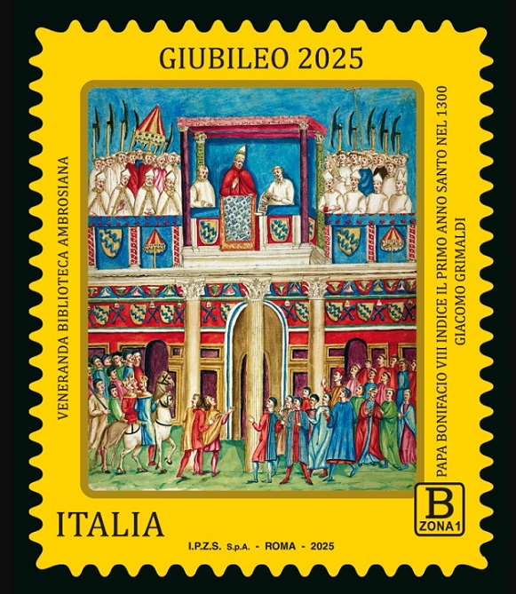 A jelenet a pápát ábrázolja, amint VIII.Bonifác a Bíborosi Kollégium által közrefogva a Lateráni Szent János bazilika loggiájáról tekint ki, azzal a céllal, hogy megáldja és egy hosszú zarándoklatra hívja a teljes búcsút kívánó híveket.