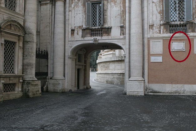 A Largo Braschinak nevezett kis téren jobbra föltekintve van a magyarok szívét melengető emléktábla rajta a magyar címerrel, Szent István koronájával és a ferde kereszttel, valamint VI. Pius pápa (Giovanni Angelo Braschi) címerével együtt latinul olvasható: itt állt a magyar zarándokház, amelyet Szent István építtetett a Rómába igyekvő magyar hívek számára. 1776-ban VI. Pius pápa bonttatta le az épületet, hogy helyére kerüljön a bazilika sekrestyéje. Ezt az emléktáblát 1929-ben Serédi Jusztinián bíboros állíttatta a bazilikát a sekrestyével összekötő folyosó külső falán.