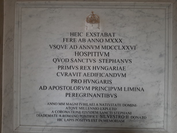 A latin nyelvű felirat emlékeztet rá, hogy itt állt 1030-tól 1776-ig az a zarándokház, amelyet Szent István, a magyarok első királya az apostolfejedelmek sírjához zarándokló magyaroknak építtetett, és utal Szent Istvánnak a II. Szilveszter Pápától kapott koronával megkoronázása 2000. jubileumi évére is, melynek alkalmából került a tábla felállításra.