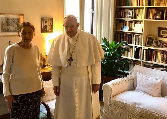 Aligha tévedek azt állítva, hogy a Tiszakarádon 1931-ben ortodox zsidó családban született Bruck Editet, akit egyesek az „életben maradt Anna Frank”-ként említenek, hisz alig 13 éves volt, amikor egész családját deportálták, és több koncentrációs tábort is megjárt, többek között Auschwitzot, Dachaut és Bergen-Belsent (édesanyja Auschwitzban, édesapja és bátyja Dachauban lelték halálukat, ám ő Eliz nevű testvérével túlélte a táborokat) – a szélesebb magyar közvélemény akkor ismerte meg, amikor a magyar lapok meg a világsajtó is kiemelt hírként számolt be arról, hogy 2021. február 20-án a római lakásán, a legnagyobb meglepetésére, egy nem akármilyen vendég látogatta meg.