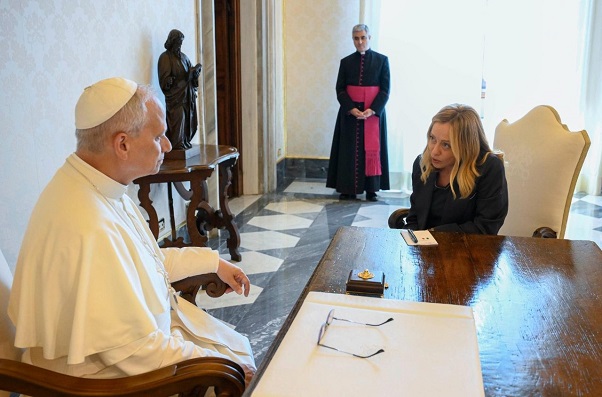 A pápa a kis trónteremben fogadta Giorgia Melonit, majd a könyvtárszobában folytattak négyszemközt megbeszélést. Az audiencia végén közös fotó készült és átadták egymásnak ajándékaikat.