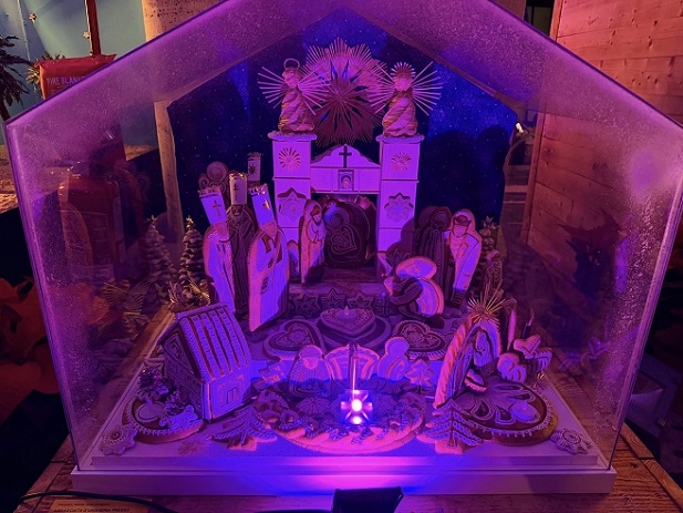 – A betlehemi történetet három szintesre készítettem, a legfelsőre helyeztem a templomot, melyben arany fényű megvilágítás emeli ki Mária alakját, a megszülető kis Jézussal. A középső szinten a három király és a pásztorok jelennek meg akik ugyan azzal a lelkülettel sietnek a megváltó csodájára. Az alsó szintre helyeztem a városi létünk világát házakkal, fenyőfákkal, állatokkal.