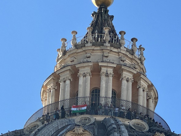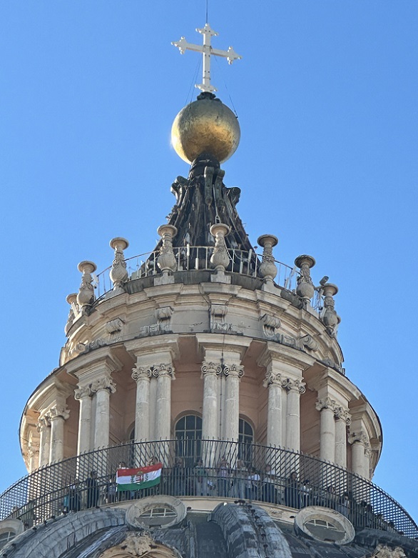 Lelkesen és még mindig zihálva mesélték, hogy éppen most szálltak alá – ezeregy lépcső után – Michelangelo kupolájából. Ott fent fedezték fel legnagyobb örömükre a magyar zászlót (és ajándékoztak meg fényképeikkel), mellyel egy magyar zarándokcsoport – ha csak egy pillanatra is – de „bevette a Vatikánt”! Bevette hittel és lelkesedéssel, hiszen még kápolnánk is van Péter sírja mellett! Az ott magyar föld, benne az Anyában, az Anyaszentegyházban.