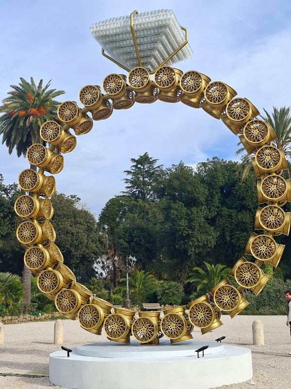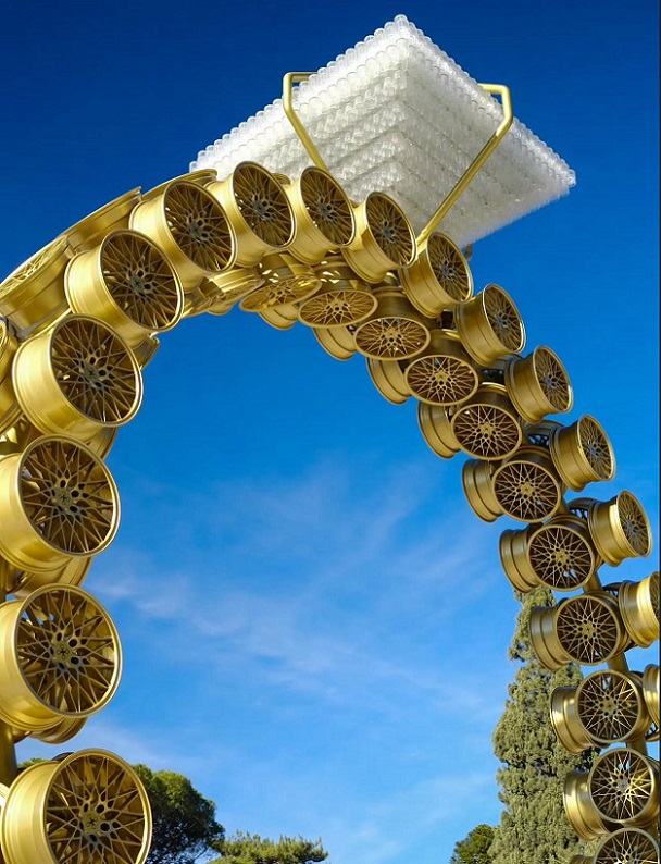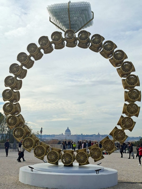 Ez az óriási „pasziánsz gyűrű” 110 arany autófelniből készült, tetején pedig egy 1450 kristálypohárból álló fordított piramis található, amelyek úgy verik vissza a fényt, mint egy lebegő gyémánt. A mű az átalakulásról, a státuszszimbólumokról és az identitásról szól, ötvözve a mesterségbeli tudást, a látványosságot és az iróniát, mindezt Róma egyik legikonikusabb nézőpontja keretezi.