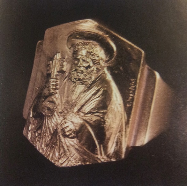 Megjegyzés: a gyűrűt "Halászgyűrűnek" nevezik, mert Szent Pétert ábrázolja, amint hálót dob a tengerbe.