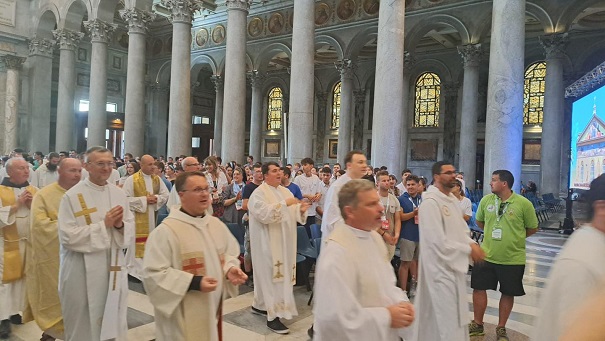 A reggeli imát ma a Kalazancius Mozgalom fiataljai vezették, majd elzarándokolt a csapat Ferenc pápa sírjhához a Santa Maria Maggiore-bazilikába.Ezután a Falakon kívüli Szent Pál-bazilikába mentek, ahol az összes magyar zarándok közös szentmisén vett részt Fábry Kornél püspök vezetésével. Az MKPK ifjúságért felelős püspöke a reményről beszélt. A remény itt van, most kezdődik: Isten szeretetében, az ima csendjében, közösségeinkben. Életünknek célja van, és a szentségek mindig segítenek az újrakezdésben. Van küldetésem, és nem vagyok egyedül - ezeket emelte ki a püspök szentbeszédében. A délutáni katekézis után az este szentségimádással zárult.
