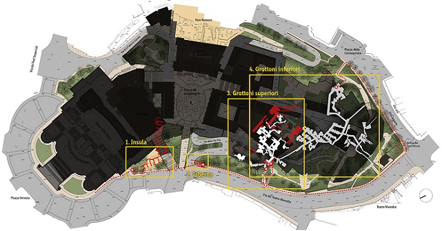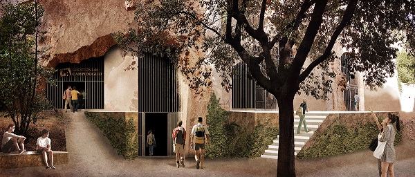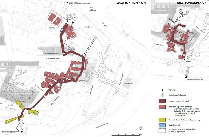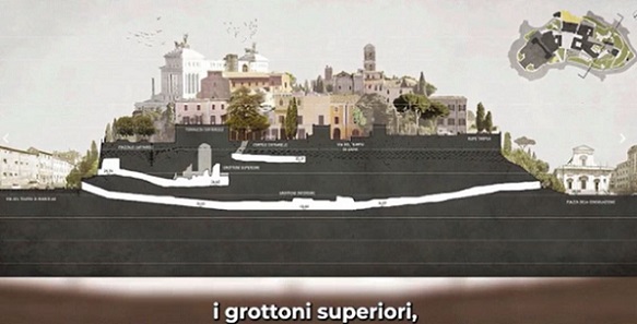 A Campidoglio grották/barlangok projekt magában foglalja a dombon kanyarogva, azt különböző irányokban és több szinten átszelő földalatti járatok és üregek konzervatív helyreállítását és fejlesztését. A barlangokat az évszázadok során sokféleképpen használták, raktárként, pinceként, vízgyűjtő ciszternaként és légoltalmi óvóhelyként a második világháború alatt. A kivételes látogatási körülmények és a helyszín egyedi jellege lehetővé teszi az alternatív turisztikai formák népszerűsítését, a régészet és a barlangászat ötvözésével, a régészeti lelőhelyek látogatók számára való hozzáférhetővé tételével, egy Antiqurium és egy Lapidárium létrehozásával, valamint Róma földalatti üregeinek természetének multimédiás installációk segítségével történő bemutatásával.