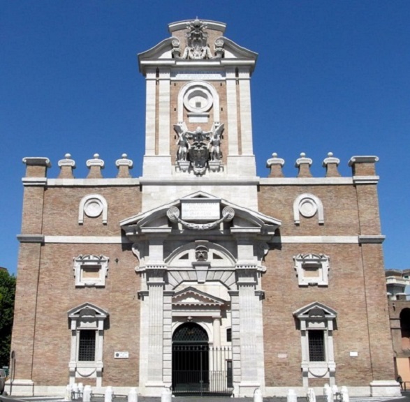 A kapu két címert tartó angyala utal a pápa középső nevére: Giovanni Angelo Medici, - a címerben a motívumok, tál, törölköző, - utalnak a család eredeti borbély foglalkozására. Éppen csak néhány tégla vastagságú a homlokzat. Nem kifelé, hanem a város felé tekintett. Játékos benyomást kelt, ünnepi díszletnek látszik.