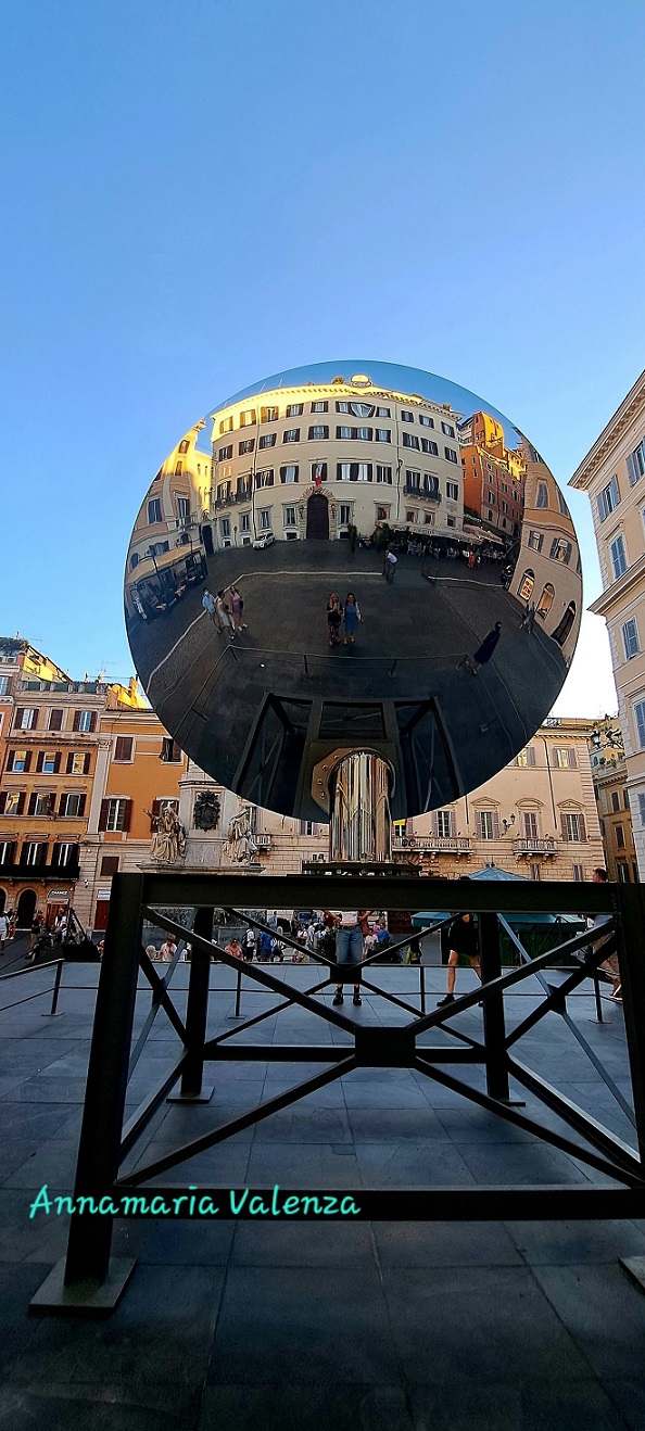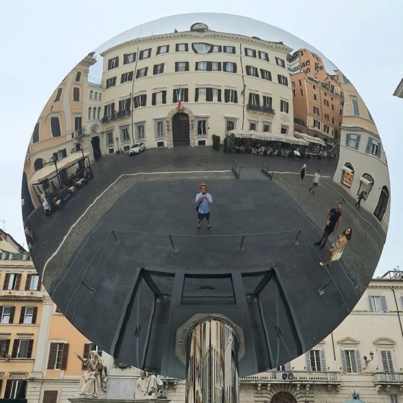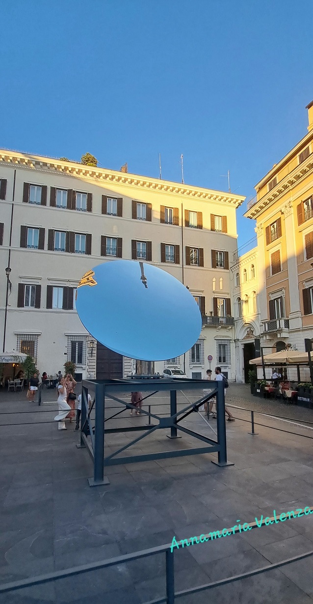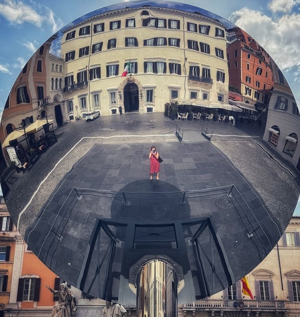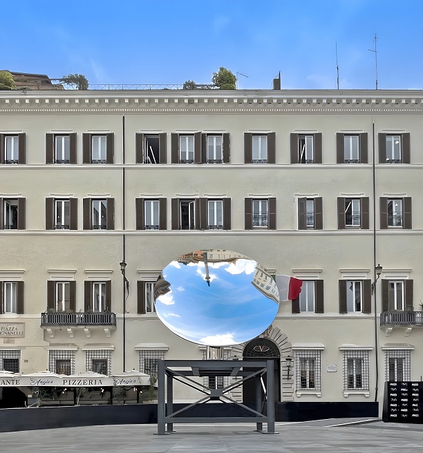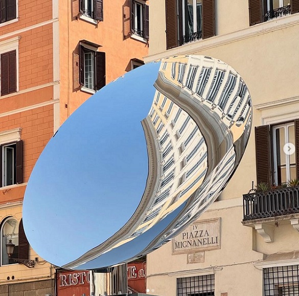 Rómában 2025. augusztus 31-ig a Spanyol lépcső közelében, a Piazza Mignanellin látható Anish Kapoor művész Sky Mirror/ Égi tükör alkotása a Valentino alapítvány jóvoltából.