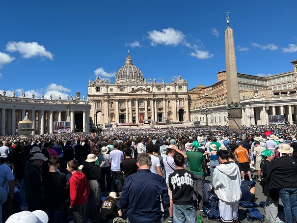 Szombaton, a temetés napján jó korán útnak indultunk a Szent Péter tér felé, de számítottunk rá, hogy a tömeg miatt nem sokat fogunk látni. A via della Conciliazione-n álltunk meg a tömegben viszonylag hátul. Nemsokkal később jöttek a szervezők és rászóltak a tömegre, hogy miért állunk meg, menjünk előrébb, van egy csomó hely. Örömmel indultunk előre és pár percen belül a Szent Péter tér közepén voltunk, ahol mindent tökéletesen láttunk és hallottunk. Megrendítő volt a fiatalokkal ezen a történelmi és kegyelmi eseményen részt venni. A szentmisén viszont sajnos rajtam kívül senki sem tudott áldozni a csapatból, mivel pont utánam hagyták abba az áldoztatást és ők már nem jutottak sorra.