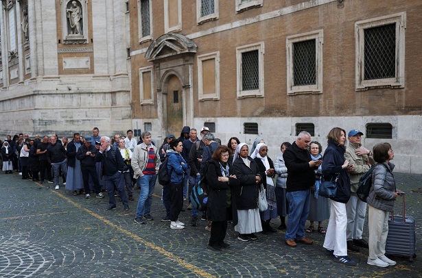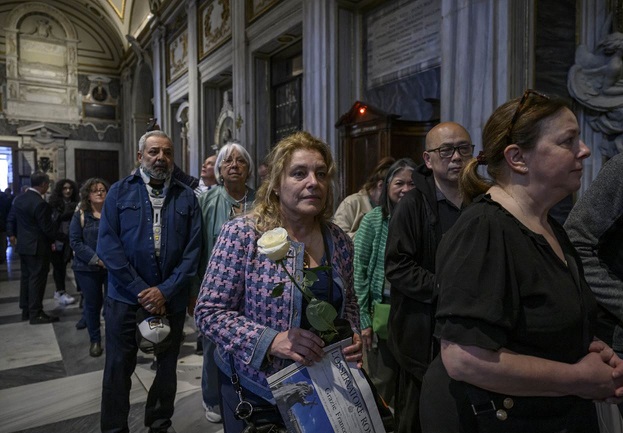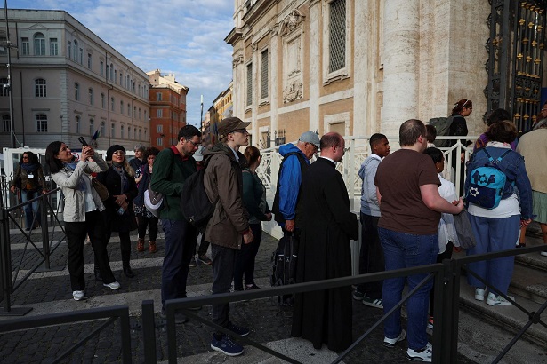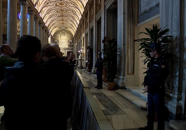 A bejáratnál Rolandas Makrickas, a bazilika főpapja fogadta az első belépőket, akik között helyi római lakosok, papok és zarándokok voltak, sokan olyanok, akik a szombati gyászmiséről érkeztek. A látogatók jellemzően egy szál fehér rózsával tisztelegnek a néhai egyházfő emléke előtt.