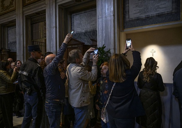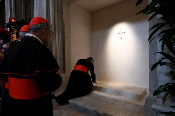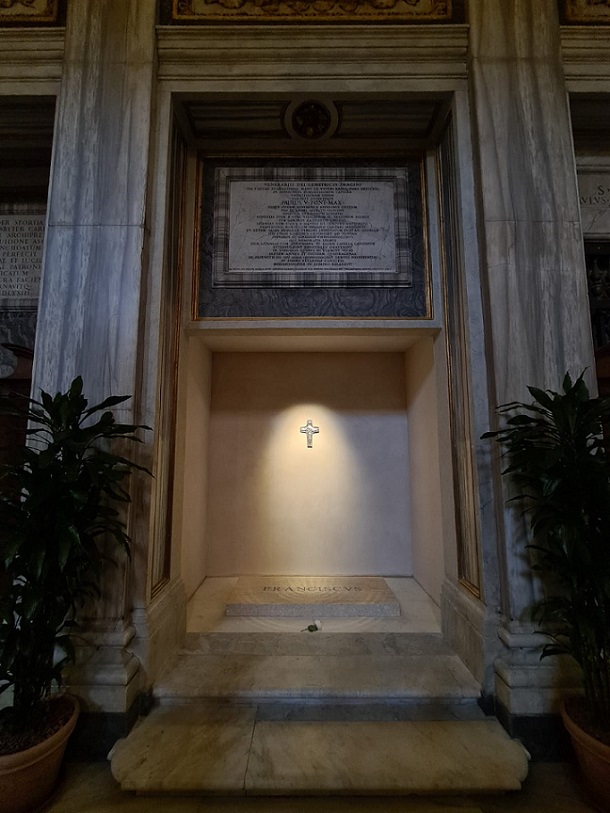 Ma reggel 7 órakor kezdődött a hívek látogatása Ferenc pápa sírjánál a Santa Maria Maggiore bazilikában, a szent kaputól kijelölt útvonal vezet el a sírhelyhez. A síremlék Liguriából – Ferenc pápa olasz nagyszüleinek szülőföldjéről – származó kőből készült; a sírkövön csak a FRANCISCUS felirat, a fülke falán pedig mellkeresztjének reprodukciója látható.