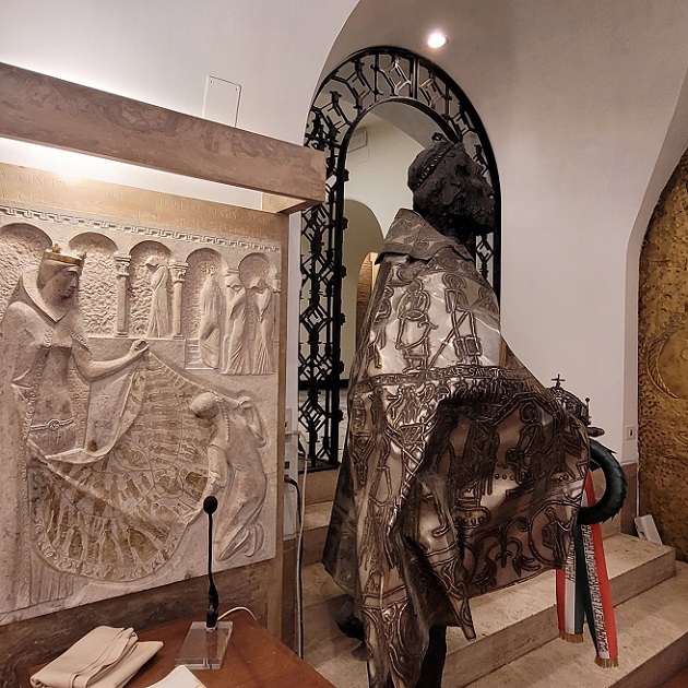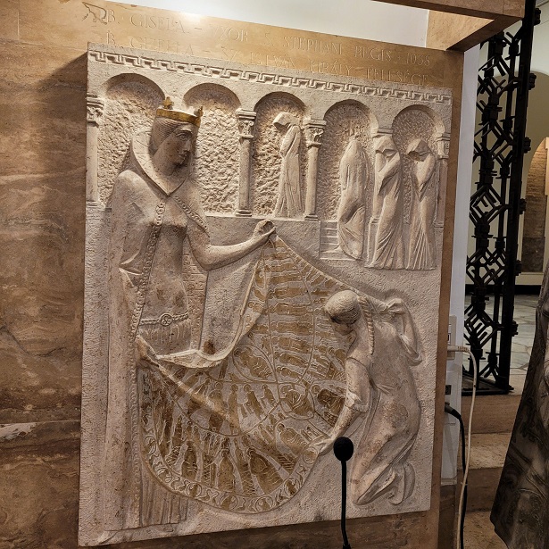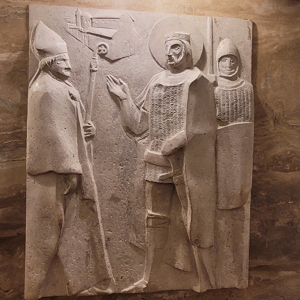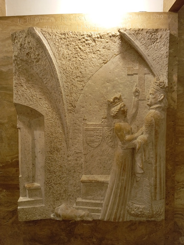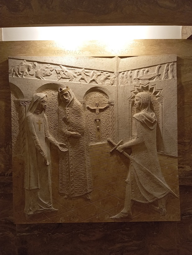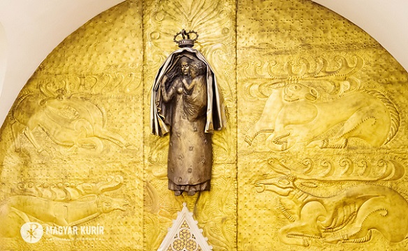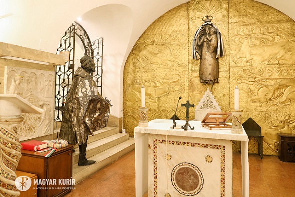 Az oltár mögötti, egész falat beborító fém dombormű Varga Imre alkotása: ősi pogány motívumvilágból bontakozik ki a gyermeket tartó Szűz szobra, felmutatva őseink útját a keresztény hit felé. Vele szemben, a kápolnába vezető lépcsősoron az idős Szent István király szobra tűnik fel, vállán a koronázási palásttal, jobb kezében a Szent Koronát tartva – a Regnum Marianum gondolatának kortárs kifejeződése ez a térbe kilépő kompozíció.