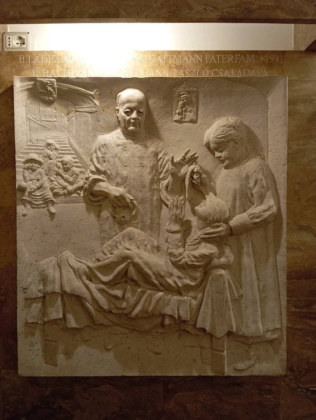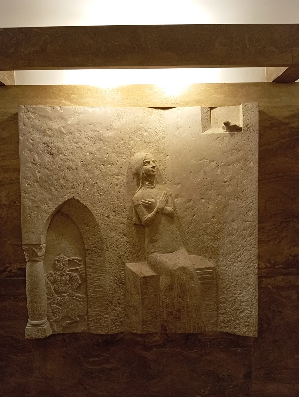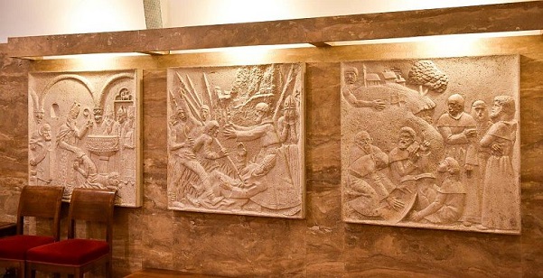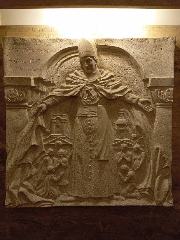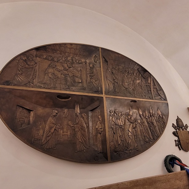 A kápolna hátsó falán a külföldön nagy pályát befutott Amerigo Tot (Tóth Imre) négyosztatú, ellipszis alakú domborműve látható, a pápák és hazánk közötti kapcsolatok négy pillanatát megragadva (II. Szilveszter és a koronaadás, III. Kallixtusz és a déli harangszó elrendelése, VI. Pál és a kápolna adományozása, II. János Pál és a kápolna megáldása).
