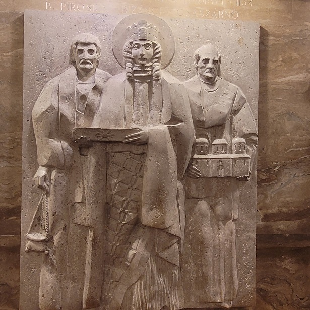 Több éven át tartó munka vette kezdetét. Hat különböző stílust képviselő művész (Csikszentmihályi Róbert, Kiss Kovács Gyula, Kiss Nagy András, Kiss Sándor, Kő Pál és Marton László) faragta meg szentjeinket, de ugyanazt a travertint használták, ugyanolyan méretben, így megmaradt a tér harmóniája. Később Boldog Batthyány-Strattmann László és Boldog Apor Vilmos domborműve is elkészült, kiegészítve a húsz eredeti faragványt (ezek Oláh Éva és Lebó Ferenc művei).