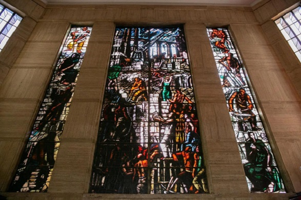 A körülbelül 75 négyzetméteres ólomüveg ablak egy hatalmas, a művészeteknek és a kézművességnek szentelt figuratív ciklust ábrázol, monumentális alakokkal, amelyek a munka termelőerejét és méltóságát szimbolizálják. A kompozíciókban olyan ipari elemek is megjelennek, mint a kémények, a propellerek és a repülőgép-rajok, amelyek a rezsim képi világát jellemző modernitás és technikai hatalom jelképei.