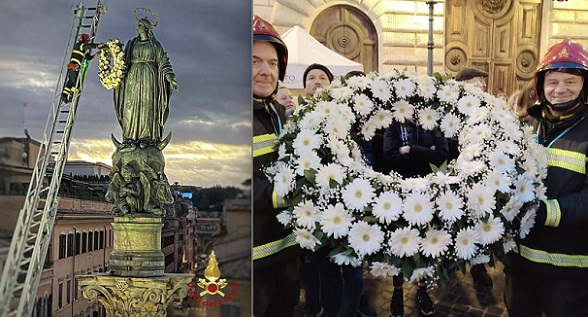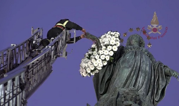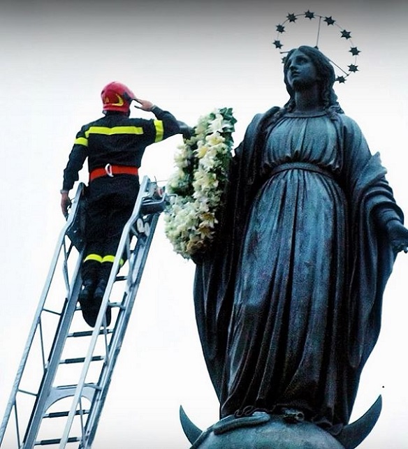 Rómában koszorút kapott a tűzoltóktól az ókori oszlopon álló Madonna 2017