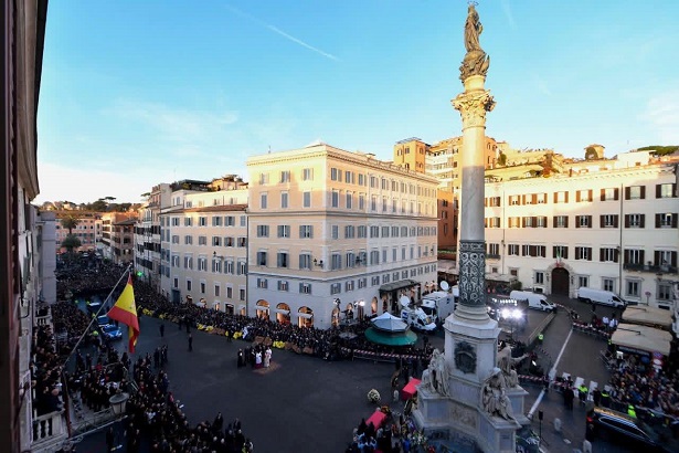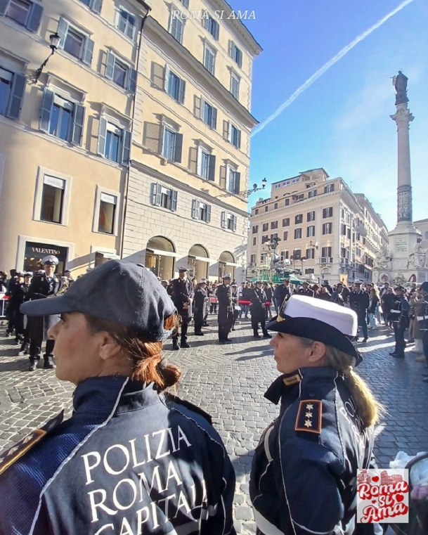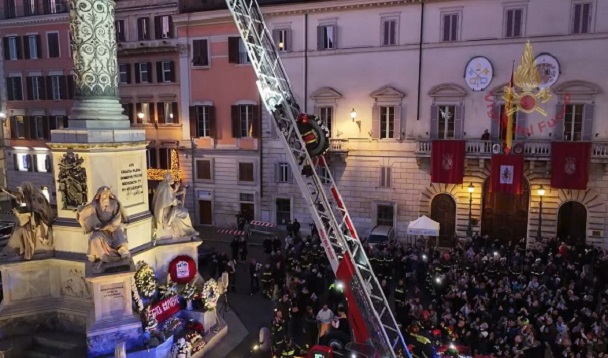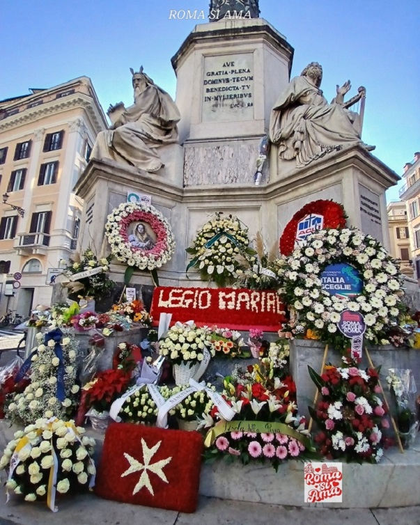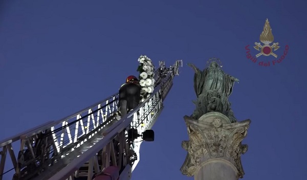 A megtiszteltetés Roberto Leo-é, a római parancsnokság legmagasabb rangú vezetőjére hárult, aki 27 méter magasra mászott a létrakocsi 100 lépcsőjén, és a virágot tiszteletadással a Szeplőtelen Fogantatás szobor karjára helyezte, így életben tartva a Nemzeti Testület és Róma város számára mélyen érintett ceremóniát.