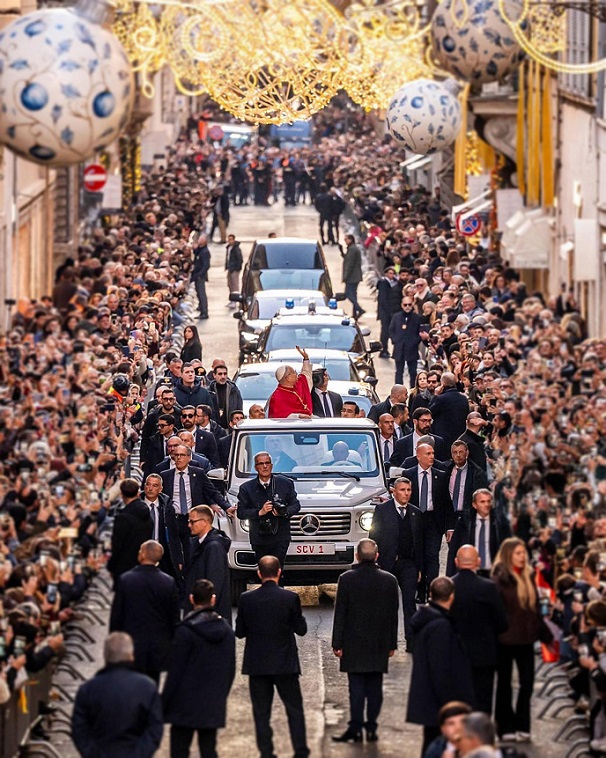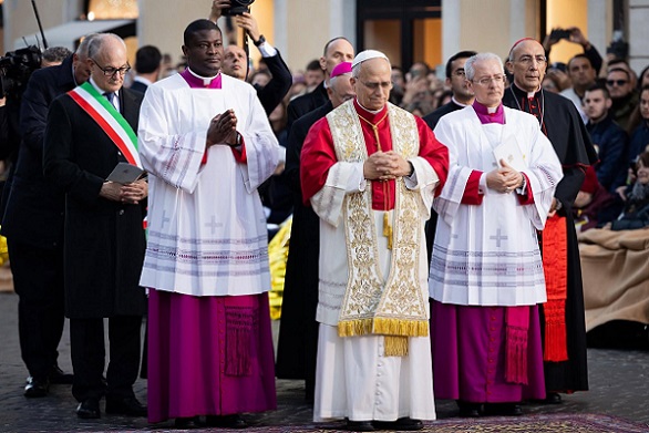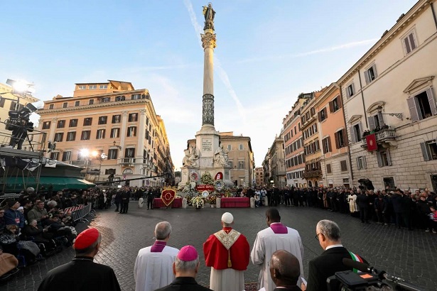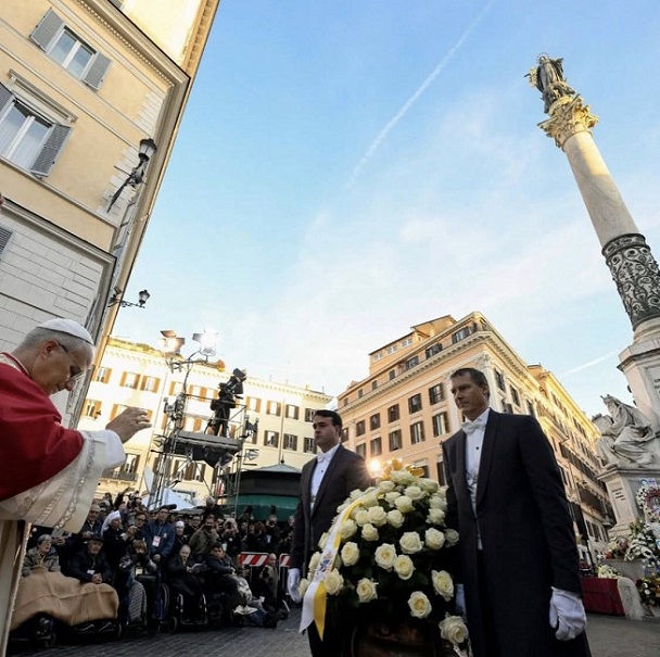 December 8-án, a Boldogságos Szűz Mária szeplőtlen fogantatásának főünnepén délután 4 h-kor Leó pápa elhagyta a Vatikánt, és a római Spanyol lépcső közeli Piazza Mignanellin található Szűzanya szoborhoz látogatott. A téren Baldo Reina bíboros vikárius és Roberto Gualtieri polgármester fogadta. Imádkoztak a 12 méter magas oszlop lábánál, amelynek tetején a Madonna szobra áll, karján a tűzoltóság által reggel 7 h-kor felvitt fehér virágkoszorúval. A tér csendje, a csendes szürke ég, a vallásosságot és a kollektív identitást egyesítő gesztus érzelme teszi ezt a pillanatot egyedülálló és mélyen megindító eseménnyé.