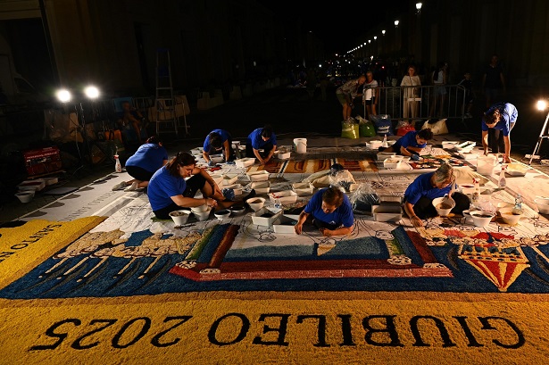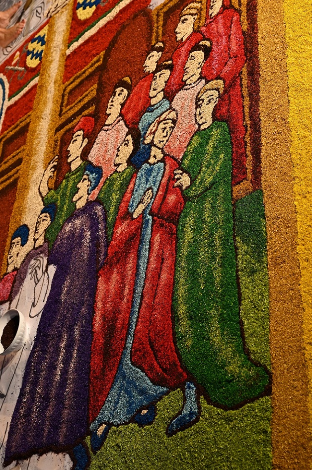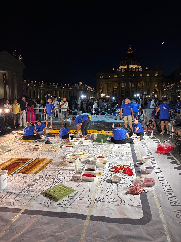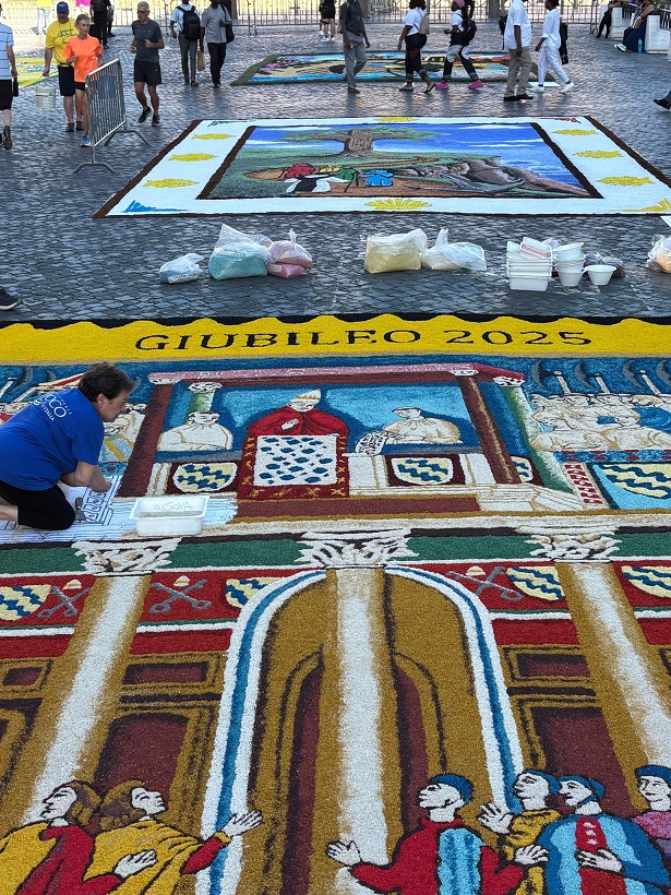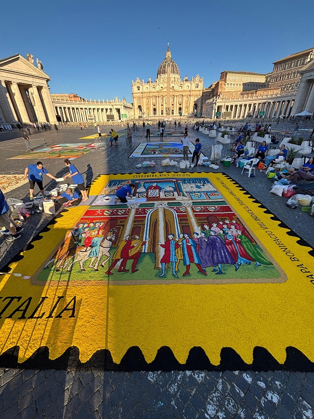 Sok szép virágszőnyeg készült június végén Rómában Péter Pál ünnepén, ezek közül most kiemelek egyet, mert nemcsak szép, de az idei 2025-ös szentév történelmi kezdetét mutatja be, a legelsőt, amelyet VIII. Bonifác pápa hirdetett ki 1300-ban.