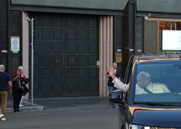 Az első ülésen ülő Szentatya az ablakból köszöntötte őket, majd az oldalsó kapun át lépett be a templomba, azon a kapun, amely előtt korábban több mint százszor állt meg a fehér Fiat 500 L Ferenc pápával, aki „édesanyját” jött üdvözölni a Santa Maria Maggiore-bazilikába.